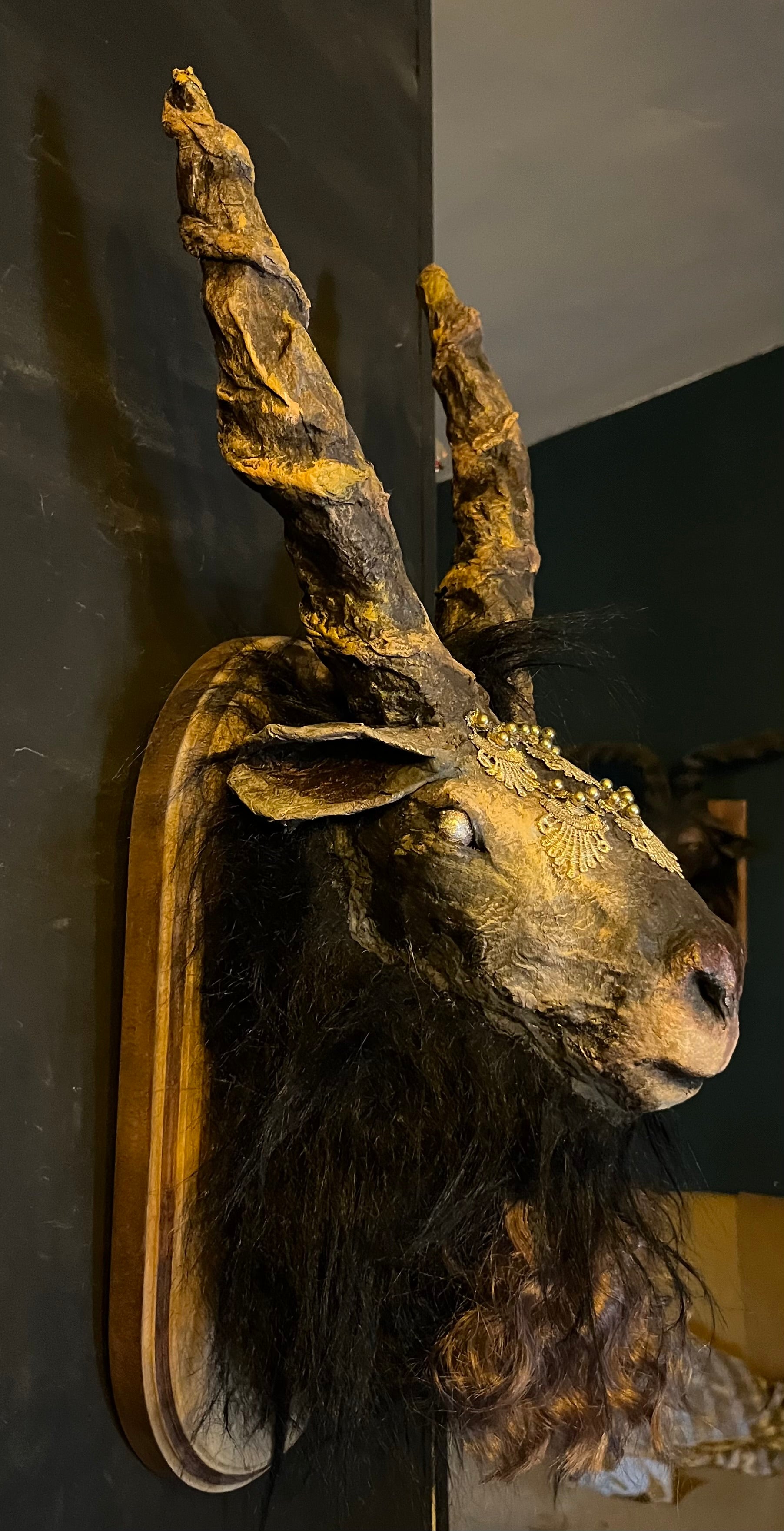 Esculpida íntegramente en papel maché, la cabeza presenta una textura orgánica que emula la piel antigua. Los cuernos, de gran envergadura y realismo, están realzados con sutiles toques dorados que resaltan su relieve. En la frente, luce una ornamentación de filigrana dorada de intrincado diseño, que evoca coronas de civilizaciones olvidadas. El conjunto se completa con una exuberante melena de pelo negro, que aporta una densidad visual y un realismo sobrecogedor.